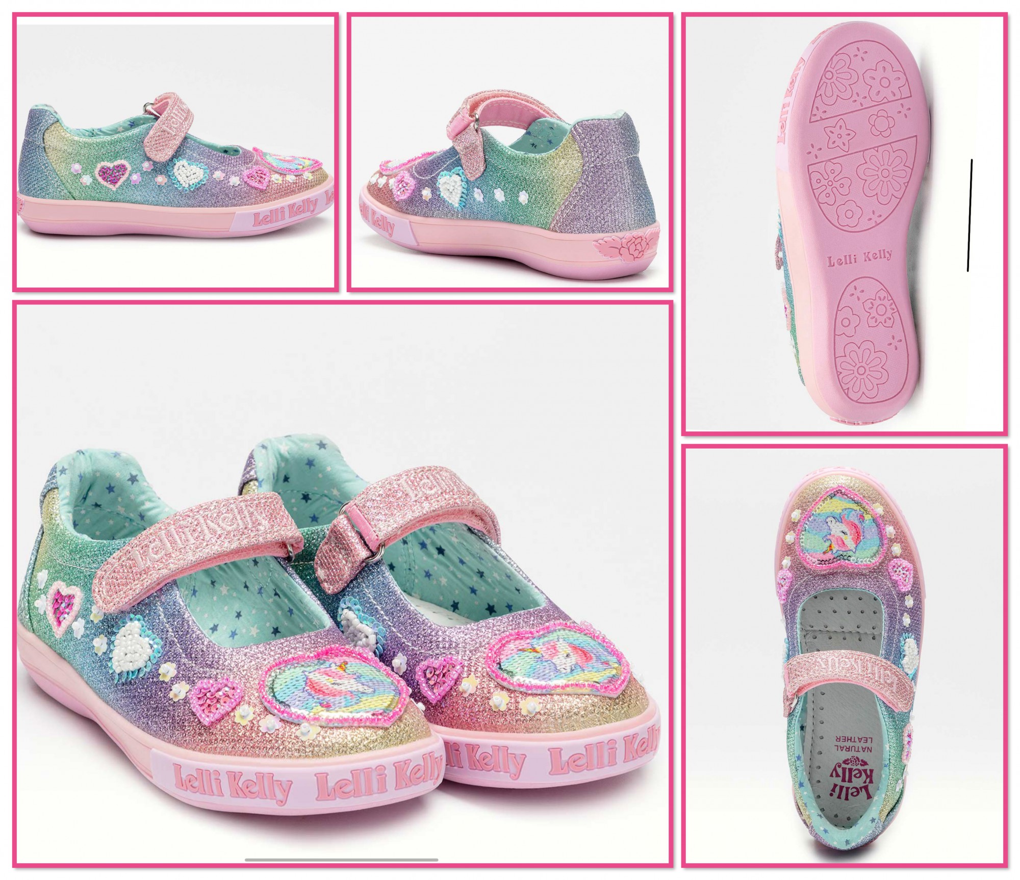 LELLI KELLY new season Styles with these adorable glitter backdrop and beaded unicorn details. Stunning Hand Stitched Italian Designer Brand with beads and Unicorn detail, these leather lined beauties feature a flexible rubber sole, adjustable rip tape Velcro fastening, Front Rubber logo Banding .