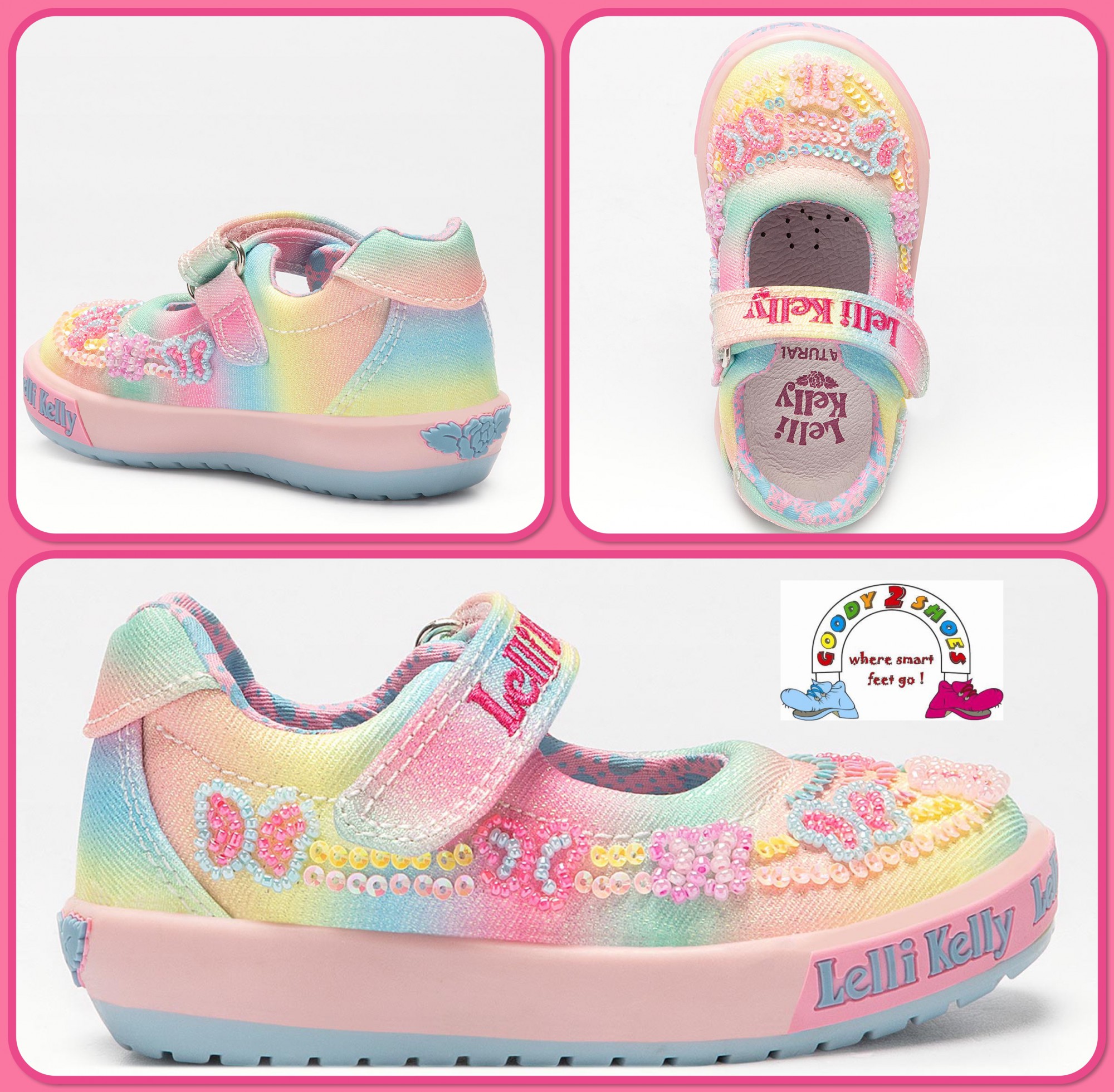 Lelli Kelly Myla baby rainbow shimmering shoes are simply beautiful. Coming in a shimmering rainbow effect upper and have a series of beaded butterflies scattered on the uppers of the shoes. Hook and Loop fastening for easy on/off. Blue sole unit with Lelli Kelly branding completes the look