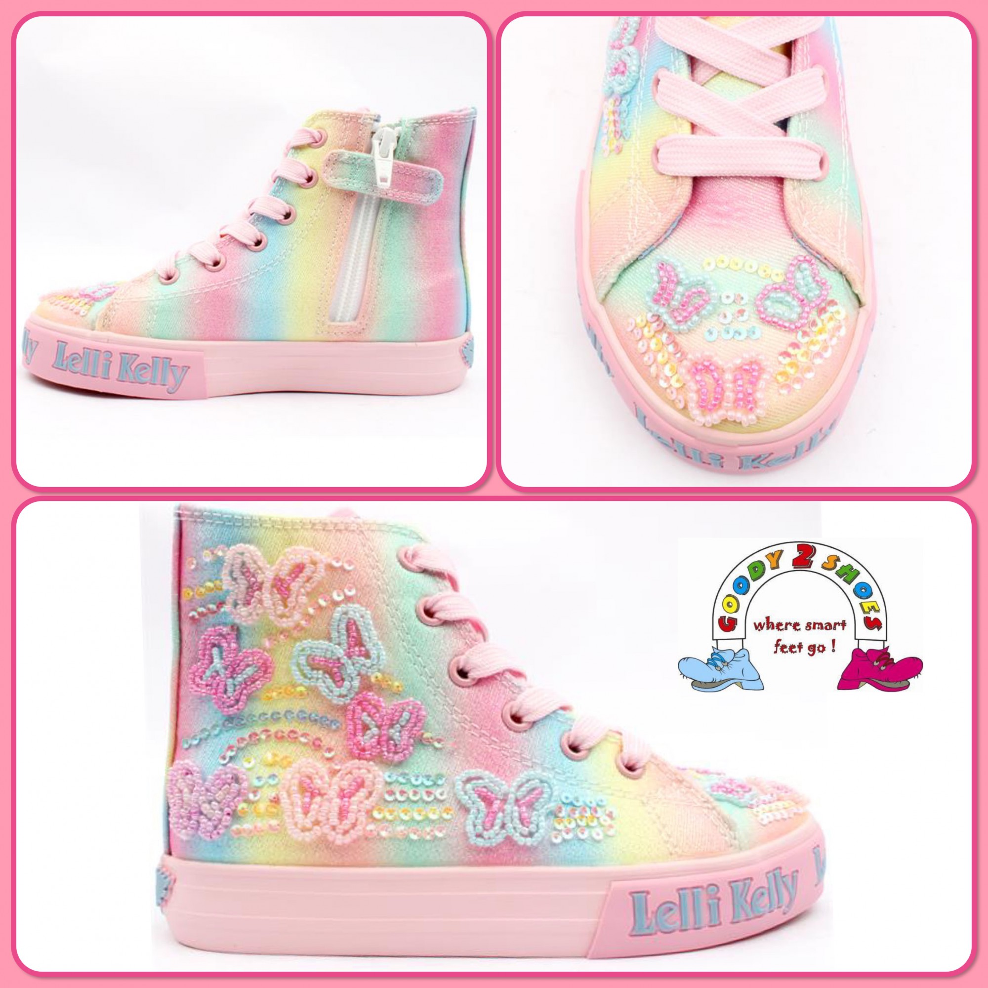 Lelli Kelly Myla NEON rainbow shimmering HI-TOPS are simply beautiful. Coming in a shimmering rainbow effect upper and have a series of beaded butterflies scattered on the uppers of the mid boots. Lace fastening and inner zip for easy on/off. Blue sole unit with Lelli Kelly branding completes the look