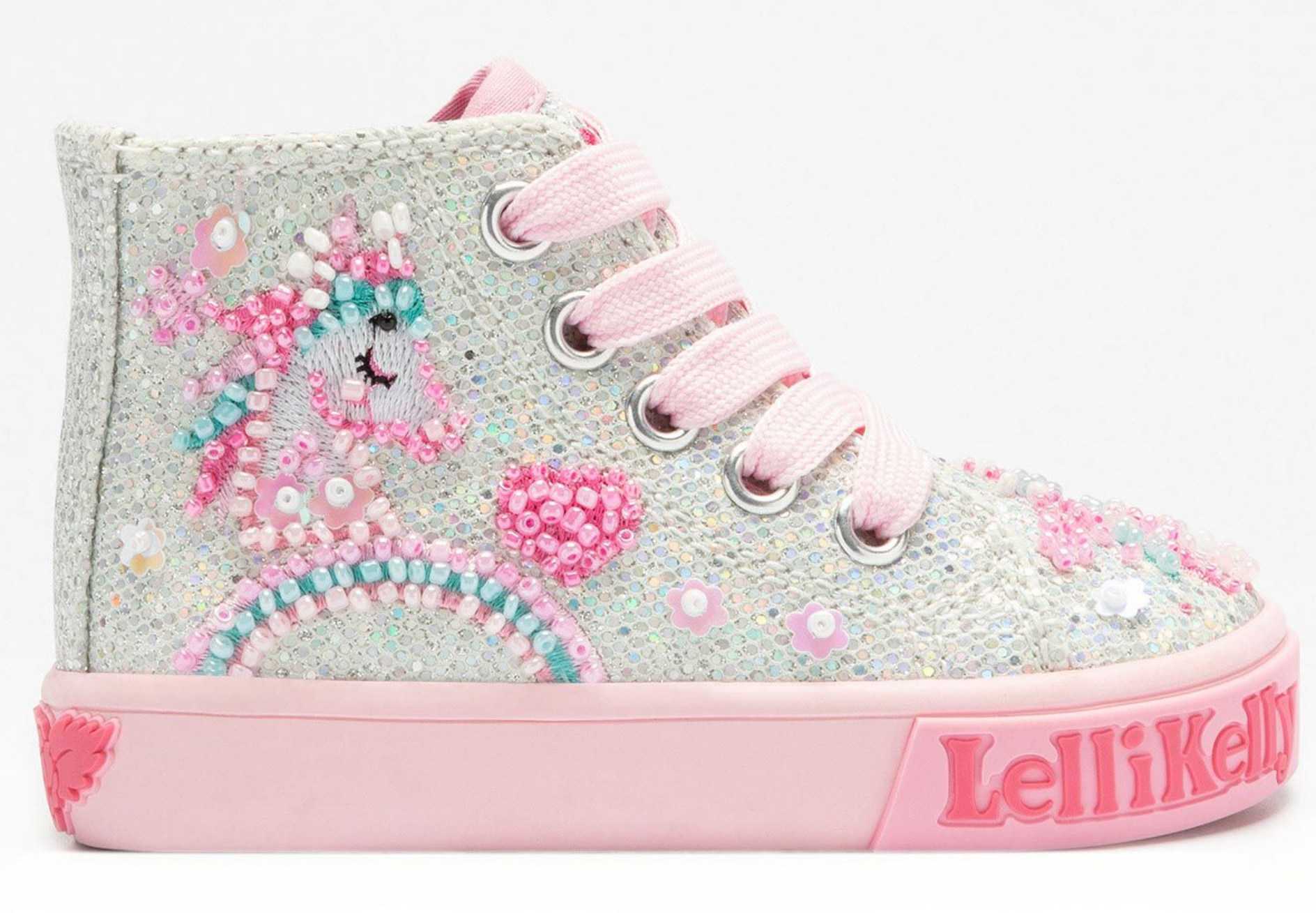 Lelli Kelly SILVER HI TOP shimmering Mid Boots are simply beautiful. Coming in a shimmering rainbow effect upper and have a series of beaded butterflies scattered on the uppers of the hi-tops. Lace fastening with inner zipper for easy on/off. Blue sole unit with Lelli Kelly branding completes the look
