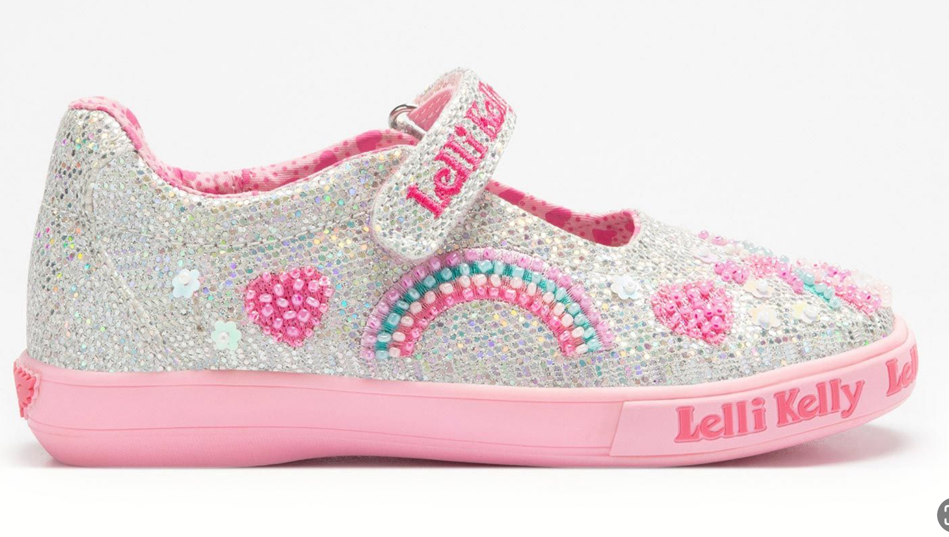 Lelli Kelly SILVER DOLLY shimmering are simply beautiful. Coming in a shimmering rainbow effect upper and have a series of beaded butterflies scattered on the uppers of the hi-tops. Lace fastening with inner zipper for easy on/off. Blue sole unit with Lelli Kelly branding completes the look