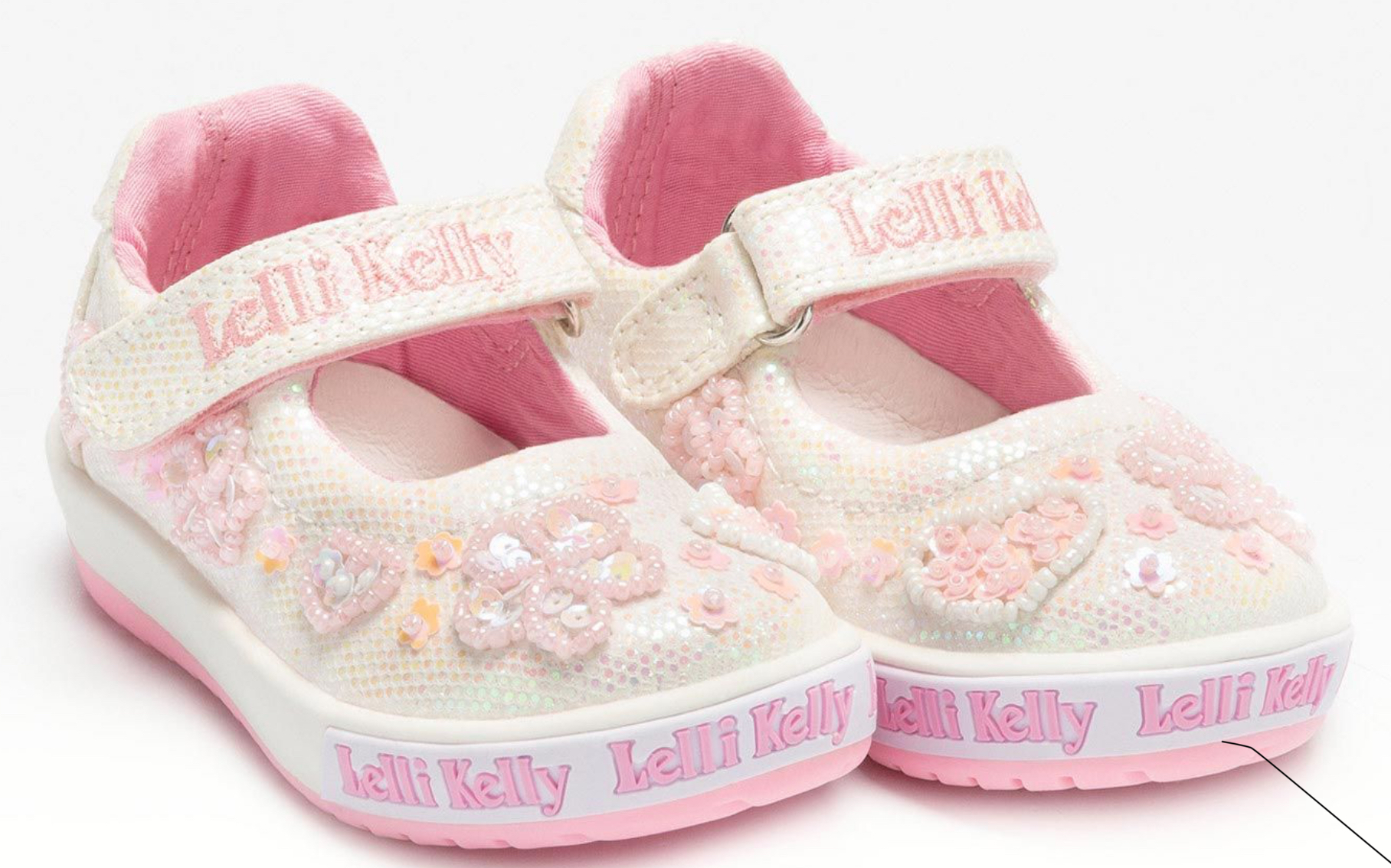 Stunning pearl heart detail white glitter canvas with velcro strap .