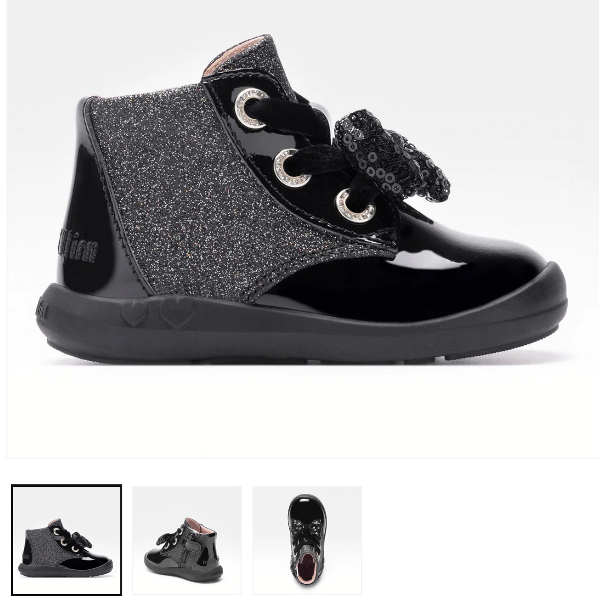 Shiny black patent leather ankle boots for baby, toddler girls by Lelli Kelly, with an embroidered logo on the heel. They fasten with laces for an adjustable fit and have a side zip and velcro tab for quick and easy changing. Softly padded around the ankle, they have a textile mesh lining and a leather insole. The practical, non-slip rubber outer soles have treads for improved grip on wet surfaces.