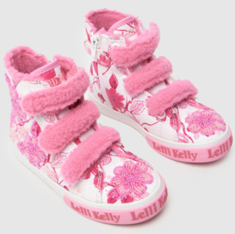 The JUNIOR Brooke 2 Mid trainers from Lelli Kelly have landed These cute mid top trainers feature a white man-made upper with an embellished pink floral pattern throughout. Bold branding and three pink fizzy hook-and-loop straps complete!