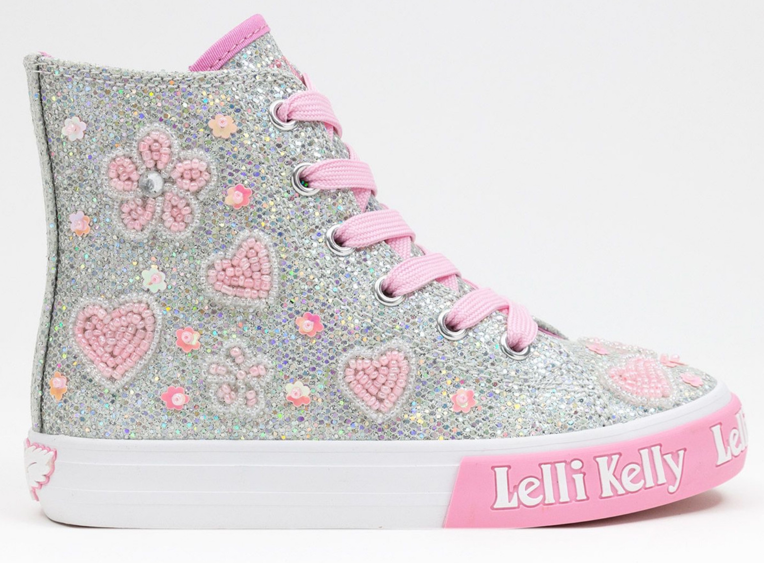 SHIMMERY STUNNING HI TOP, BEADED WITH HEART DETAILS   ZIP AND LACES FOR GREAT ADJUSTMENT AND EASY ON AND OFF
