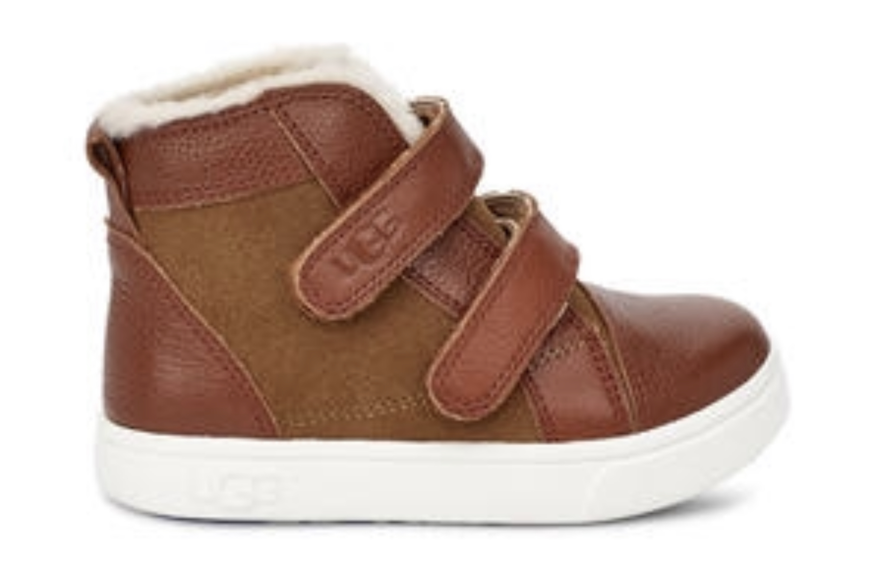 This distinctive high-top has been scaled down in size, but not in style. Made from soft suede with leather panels and a little fluff, it features hook-and-loop closures for easy on and off.