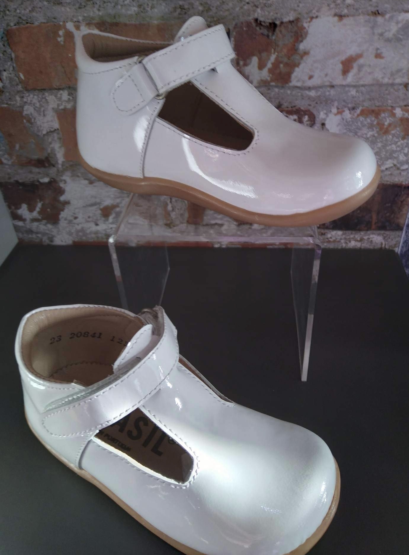 WithT bar and a single velcro fastening, this Petasil first walker is an ideal shoe for those first steps. Stunning in white patent