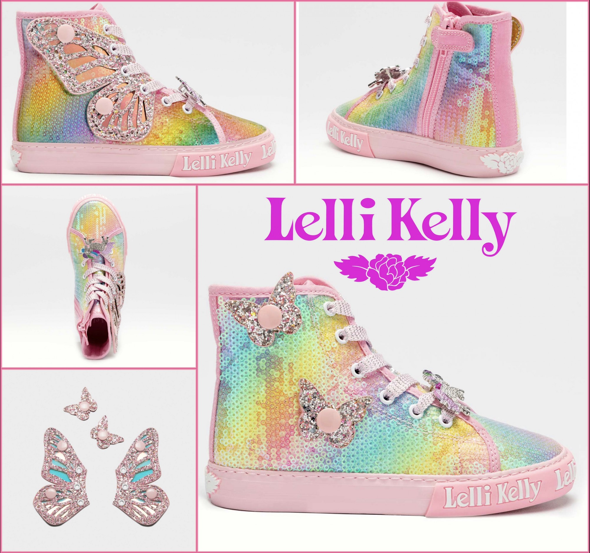Hi-Top boot with detachable glitter fairy wings, laces thread through the front and can be used to adjust the fitting, side zip for easy fitting - a separate set of small glitter butterflies can be attached to the studs that the Fairy Wings are attached to. Rainbow sequins all over.